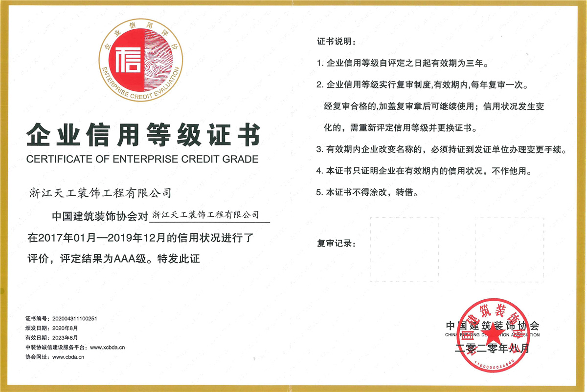 浙江天工裝飾工程有限公司成立于1994年,是一家專注于建筑行業(yè)近三十年,余杭區(qū)內(nèi)規(guī)模最大、最專業(yè)的現(xiàn)代化專業(yè)承包企業(yè),連續(xù)十二年榮獲“余杭區(qū)建筑業(yè)十強(qiáng)企業(yè)”稱號(hào)。公司現(xiàn)任余杭區(qū)建筑裝飾行業(yè)協(xié)會(huì)會(huì)長(zhǎng)單位、杭州市建筑裝飾行業(yè)協(xié)會(huì)副會(huì)長(zhǎng)單位、浙江省建筑裝飾行業(yè)協(xié)會(huì)副會(huì)長(zhǎng)單位、中國(guó)建筑裝飾協(xié)會(huì)理事單位。公司具備建筑裝修裝飾工程專業(yè)承包壹級(jí)、建筑幕墻工程專業(yè)承包壹級(jí)、建筑裝飾工程設(shè)計(jì)專項(xiàng)甲級(jí)、建筑幕墻工程設(shè)計(jì)專項(xiàng)甲級(jí)、展覽陳列工程設(shè)計(jì)施工一體化貳級(jí)、電子與智能化工程專業(yè)承包貳級(jí)、消防設(shè)施工程專業(yè)承包貳級(jí)、防水防腐保溫工程專業(yè)承包貳級(jí),集建筑工程施工總承包、建筑機(jī)電安裝、城市及道路照明、鋼結(jié)構(gòu)、結(jié)構(gòu)補(bǔ)強(qiáng)、安防施工等多項(xiàng)資質(zhì)。主要從事大型公共建筑、星級(jí)酒店的室內(nèi)精裝修、建筑幕墻及建筑智能化工程的設(shè)計(jì)與施工。 天工裝飾始終把建筑裝飾當(dāng)作一項(xiàng) “美的事業(yè)”,在施工中嚴(yán)把質(zhì)量關(guān),不斷規(guī)范和提升工程技術(shù)標(biāo)準(zhǔn)。近年來(lái),公司承建的浙商開(kāi)元名都國(guó)際酒店I標(biāo)段裝飾工程、杭州藝尚雷迪森廣場(chǎng)酒店裝修工程、余杭區(qū)時(shí)代廣場(chǎng)5號(hào)樓(市民之家)室內(nèi)裝飾工程、永安之星室內(nèi)裝飾工程、青山湖科技城創(chuàng)業(yè)廣場(chǎng)裝修工程、杭州未來(lái)科技城醫(yī)院室內(nèi)裝飾工程、杭州師范大學(xué)附屬實(shí)驗(yàn)學(xué)校裝修工程、杭州老板電器股份有限公司辦公樓裝飾工程、深川控股集團(tuán)綜合樓幕墻工程、浙江省科技信息研究院幕墻工程、北航杭州創(chuàng)新研究院(余杭)內(nèi)裝及智能化提升改造項(xiàng)目(研究生院)工程、臨平新城人才服務(wù)中心設(shè)計(jì)釆購(gòu)施工(EPC)工程總承包項(xiàng)目、浙江大學(xué)先進(jìn)電氣裝備創(chuàng)新中心室內(nèi)外裝飾及改造項(xiàng)目設(shè)計(jì)采購(gòu)施工(EPC)工程總承包項(xiàng)目等,先后獲得“中國(guó)建筑工程裝飾獎(jiǎng)”、“全國(guó)建筑裝飾科技創(chuàng)新獎(jiǎng)”、浙江省建設(shè)工程“錢江杯”優(yōu)質(zhì)工程獎(jiǎng)、杭州市建設(shè)工程“西湖杯”優(yōu)質(zhì)工程獎(jiǎng)、嘉興市建設(shè)工程“南湖杯”優(yōu)質(zhì)工程獎(jiǎng)、“浙江省優(yōu)秀建筑裝飾工程獎(jiǎng)”、“浙江省優(yōu)質(zhì)安裝質(zhì)量獎(jiǎng)”等榮譽(yù)。 天工裝飾恪守“誠(chéng)實(shí)守信、文明經(jīng)營(yíng)”,近年來(lái)公司得到了客戶的信賴也獲得了業(yè)界的好評(píng),先后被評(píng)為“國(guó)家級(jí)守合同重信用單位”、“全國(guó)建筑裝飾行業(yè)AAA級(jí)信用企業(yè)”、“全國(guó)百家科技創(chuàng)新型企業(yè)”、“浙江省AAA級(jí)守合同重信用單位”、“人民銀行信用等級(jí)AAA級(jí)企業(yè)”、“浙江省信用管理示范企業(yè)”、“浙江省誠(chéng)信企業(yè)”、“浙江省建筑裝飾行業(yè)強(qiáng)優(yōu)企業(yè)”、“杭州市建筑業(yè)優(yōu)秀企業(yè)”、“余杭區(qū)建筑業(yè)十強(qiáng)企業(yè)”、 “余杭區(qū)人民政府質(zhì)量獎(jiǎng)”等榮譽(yù)。